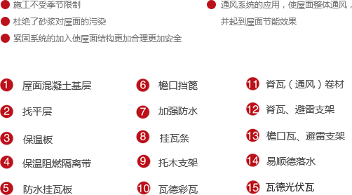 借鑒歐洲坡屋面防水理念,將平面防水改為立體防水,采用新型防水板材料,將材料防水和構造防水于一身,配合屋面系統組件,實現全天候全干作業。節(jié)省了屋面各類保護層次,打破了屋面冬季及雨后陰濕無法施工的常規(guī),縮短了工期,提升系統安全性能。